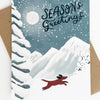 Introducing the Seasons Greeting's Midnight Moonscape & Dog Greeting Card, a charming and whimsical way to send holiday wishes to your loved ones. This beautifully designed card features an enchanting illustration of a dog frolicking in the mountains under a moonlit sky, surrounded by stars, mountains, and trees. It's the perfect blend of festivity and nature, capturing the spirit of the season in a unique and delightful way.