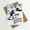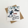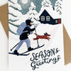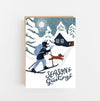 Capture the serene beauty of a winter wonderland with the "Seasons Greeting's Midnight Moonscape Skiing & Dog" greeting card. This enchanting scene features a skier and their faithful dog gracefully moving through a magical landscape under a canopy of shimmering stars and a glowing moon, all while heading towards a charming, cozy hut nestled in the woods. This card is perfect for conveying warmth and joy during the holiday season, or simply to send a heartfelt message to a loved one.
