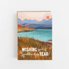 Capture the awe-inspiring beauty of nature and send heartfelt wishes with the "Wishing You a Spectacular Year" Greeting Card. This exquisite card features an enchanting sunrise landscape over majestic mountains, painted in vibrant shades of orange, pink, and purple. In the foreground lies a tranquil loch, while in the distance, a charming wee bothy nestles in the hills, gazing across the serene waters.